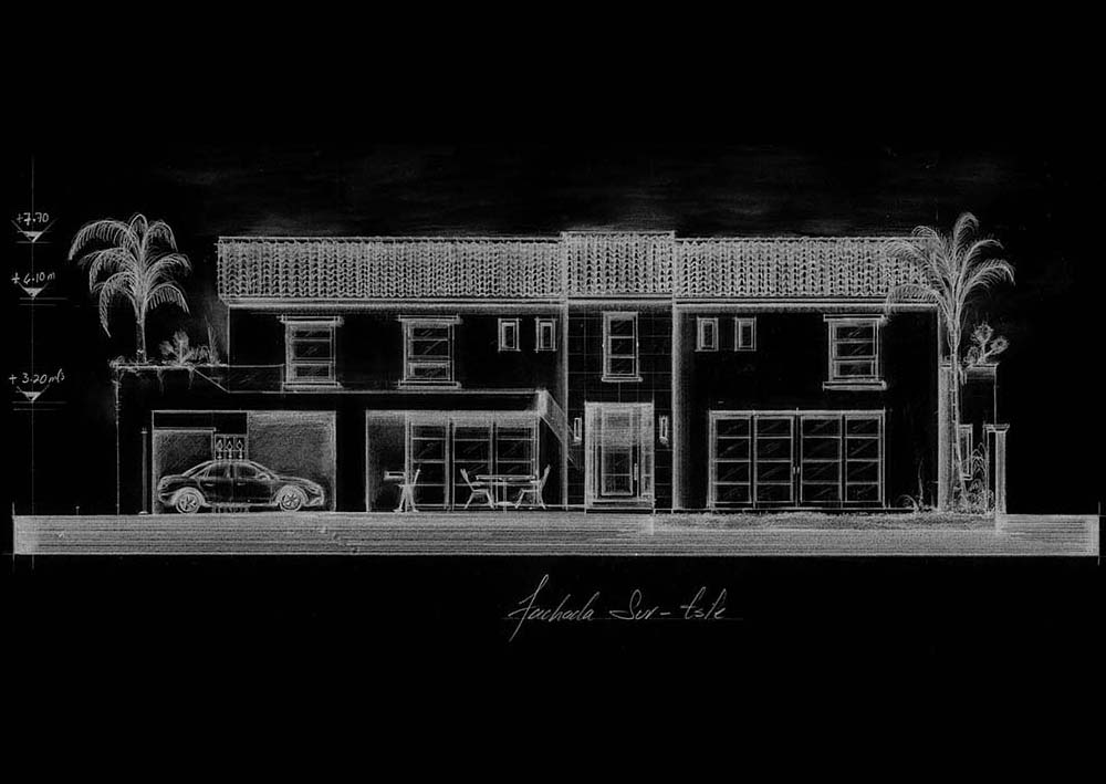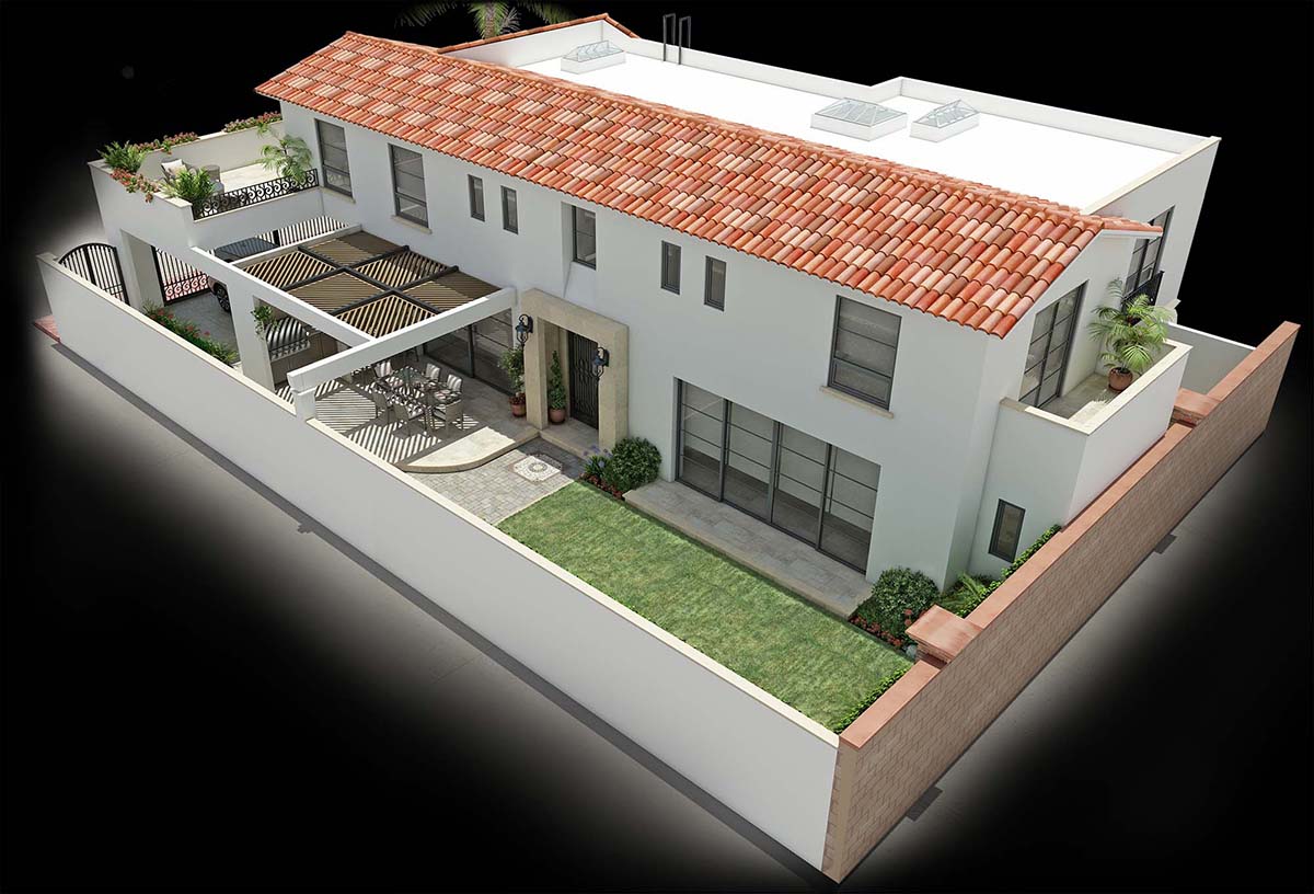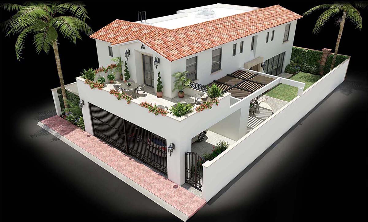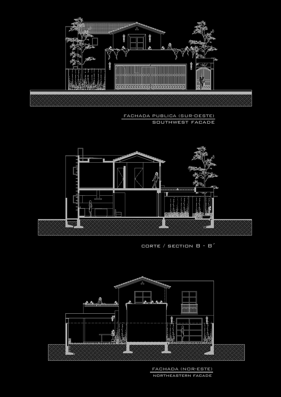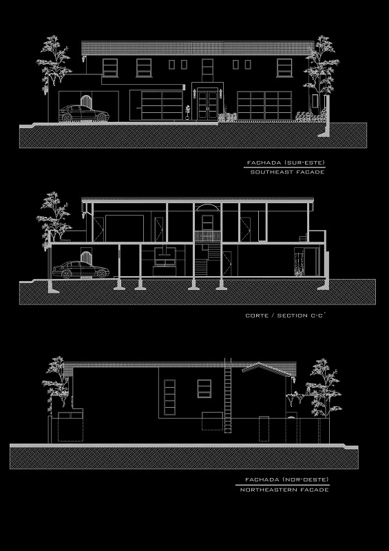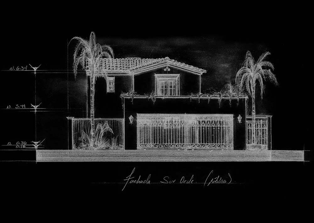 Casa habitación de estilo neocolonial resuelta en dos plantas. El esquema general abre a una terraza y a un jardín lateral ubicados al sureste, la cancelería corrediza escamoteable en los muros disipa la barrera entre el espacio exterior e interior, fundiendo estas áreas a las zonas de uso común (cocina, comedor, sala y bar), logrando una sensación de apertura y amplitud. Se accede por un vestíbulo central a doble altura que divide la casa en dos. La sala de tv incorpora baño completo y se abre al jardín posterior (noreste), los servicios también se ubican en planta baja. Un estudio, tres habitaciones, cuatro vestidores y tres baños conforman el segundo nivel. La recámara principal cuenta con una gran terraza-solarim.